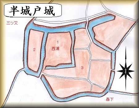 半城戸城は開発によってほとんど遺構を留めていない。そこで、『愛知県中世城館跡調査報告』に掲載されている地籍図から旧状を想像してみると、右の鳥瞰図のようになる。