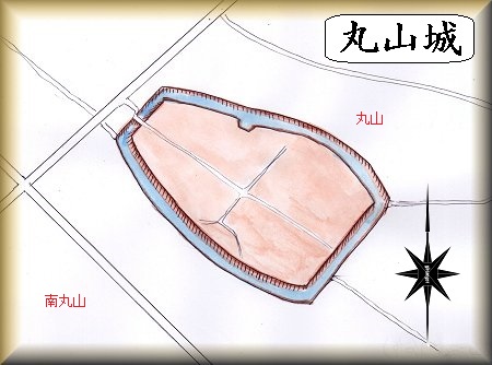 丸山城は宅地化と耕地整理によってほとんど遺構を留めていない。そこで、『愛知県中世城館跡調査報告』に掲載されている地籍図から旧状を想像してみると、右の鳥瞰図のようになる。