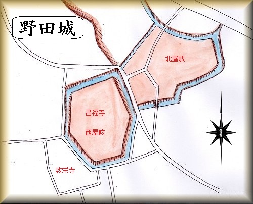 野田城は開発によってほとんど遺構を留めていない。そこで、『愛知県中世城館跡調査報告』に掲載されている地籍図から旧状を想像してみると、右の鳥瞰図のようになる。