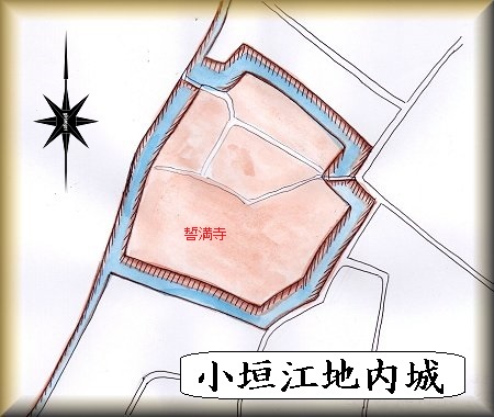 小垣江地内城は開発によってほとんど遺構を留めていない。そこで、『愛知県中世城館跡調査報告』に掲載されている地籍図から旧状を想像してみると、右の鳥瞰図のようになる。