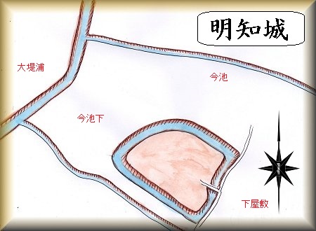 明知城は耕地整理や市街地化によって、まったく遺構を留めていない。そこで、『愛知県中世城館跡調査報告』に掲載されている地籍図から旧状を想像してみると、右の鳥瞰図のようになる。