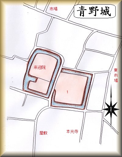 青野城は開発によってほとんど遺構を留めていない。そこで、『愛知県中世城館跡調査報告』に掲載されている地籍図から旧状を想像してみると、右の鳥瞰図のようになる。