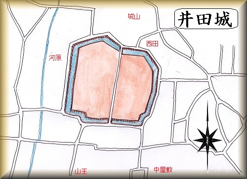井田城は開発によって遺構の過半を失ってしまっている。そこで、『愛知県中世城館跡調査報告』に掲載されている地籍図から旧状を想像してみると、右の鳥瞰図のようになる。