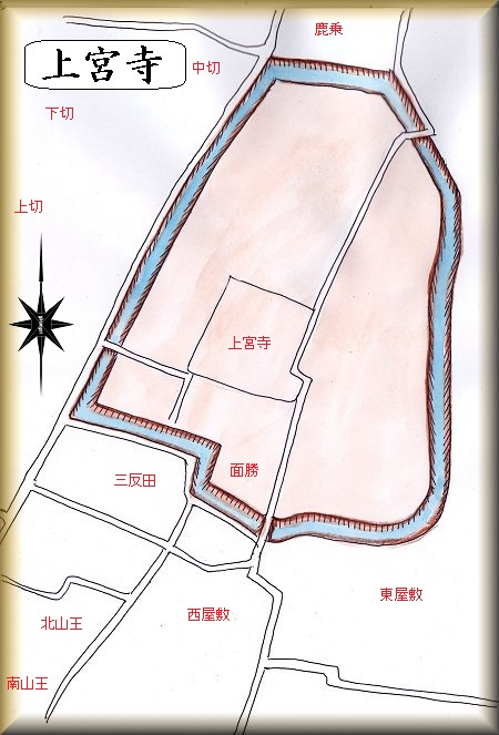 上宮寺の外郭の堀は開発によってほとんど遺構を留めていない。そこで、『愛知県中世城館跡調査報告』に掲載されている地籍図から旧状を想像してみると、右の鳥瞰図のようになる。