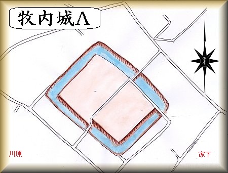 牧内城Aは開発によって、ほとんど遺構を留めていない。そこで、『愛知県中世城館跡調査報告』に掲載されている地籍図から旧状を想像してみると、右の鳥瞰図のようになる。