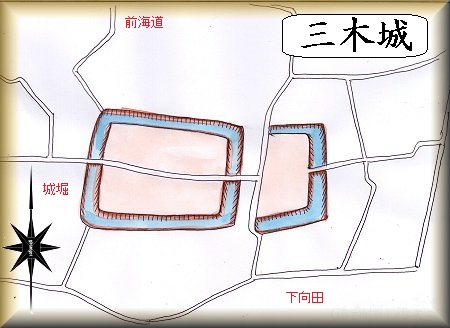 三木城は市街地化によってほとんど遺構を留めていない。そこで、『愛知県中世城館跡調査報告』に掲載されている地籍図から旧状を想像してみると、右の鳥瞰図のようになる。