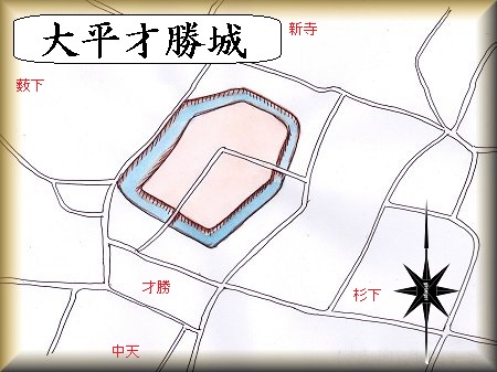大平才勝城は開発によってほとんど遺構を留めていない。そこで、『愛知県中世城館跡調査報告』に掲載されている地籍図から旧状を想像してみると、右の鳥瞰図のようになる。