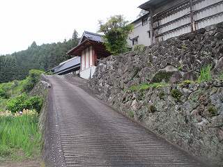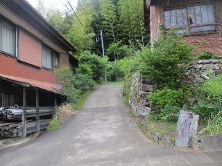 | 県道からの入口表示。 | 民家の間にある入口表示。 |