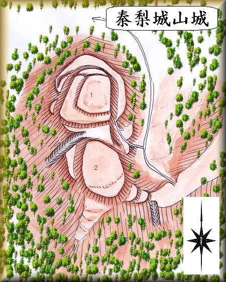 秦梨城山城は、秦梨城の粟生将監が築いた城だったという。秦梨城は比高差があまりなく要害性に劣るため、詰の城として築いたものだったのであろう。