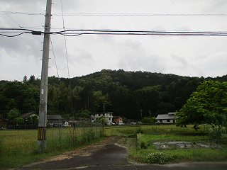 | 西方から遠望する秦梨城山。ここからの比高は80mほどある。 | 墓地脇にある登城道入口。 |