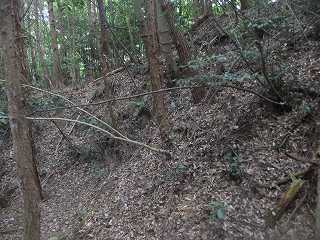 この上が2郭である。2郭の北側には幅広の鞍部があり、その西側部分には堀が掘られている。東側部分は堀状になっていないが、埋められてしまったのであろうか。堀は西側にかけて竪堀となって落ちている。