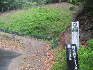 岩津城は東名高速道路の西側にそびえている比高30mほどの山稜端部に築かれている。岩津交差点辺りから城址方向に進んで行くと、城址の南側の道路沿いに案内板が設置されているのが見えてくる。車はその辺りにかろうじて1台だけなら停められる。