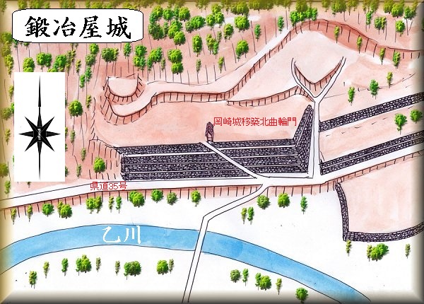 googlemapにも「旧岡崎城移築北曲輪門」として掲載されているので場所はすぐに分かる。県道35号線を通って行くと高石垣が見えてくる。ここが鍛冶屋城の跡である。