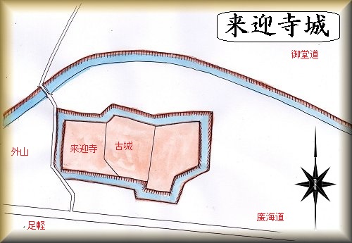 来迎寺の東側に古城地名が残されており、そこが城の中心であったと考えられる。