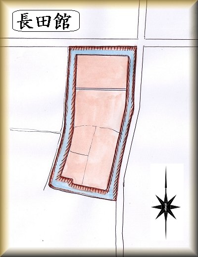 長田館の周辺は市街地化が進んでいるため、まったくその遺構を留めていない。そこで、『愛知県中世城館跡調査報告』に掲載されている地籍図から旧状を想像してみると、右の鳥瞰図のようになる。