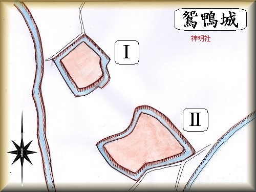 鴛鴨城は開発によってほとんど遺構を留めていない。そこで、『愛知県中世城館跡調査報告』に掲載されている地籍図から旧状を想像してみると、右の鳥瞰図のようになる。