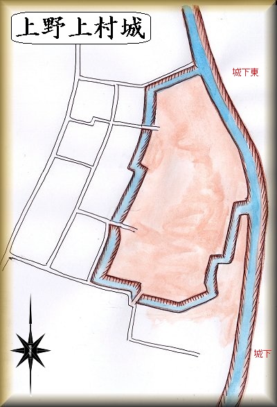 上野上村城は上郷護国神社一帯にあったらしいが、開発によってほとんど遺構を留めていない。そこで、『愛知県中世城館跡調査報告』に掲載されている地籍図から旧状を想像してみると、右の鳥瞰図のようになる。
