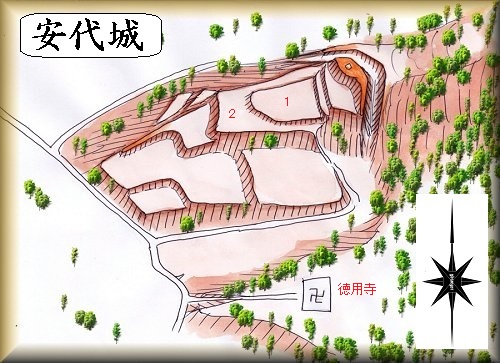 安代城は、徳用寺の北側の比高20mほどの山稜に築かれている。