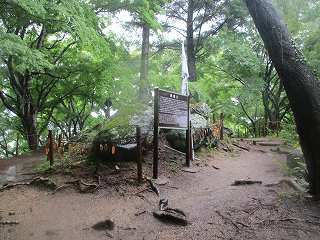 そこからテラス状の郭を経由しながら登城道を進んで1郭に登って行く。1郭には岩がいくつかあり、そこに案内板や幟が立てられていた。また、背後には東屋も設置されている。