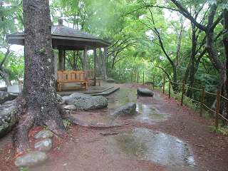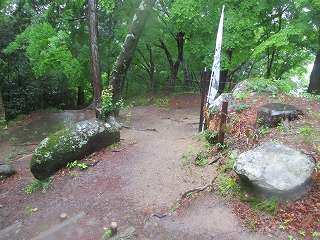 山頂なので景色がとてもいいはずなのだが、土砂降りでは霞んでしまってまったく眺望は利いていなかった。1郭は岩があることもあって、たいした居住面積は確保できていない。見張り台といったところであろうか。