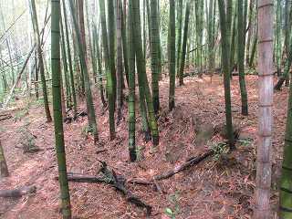 | 登城道を進んで行くと尾根に築かれた段郭群が見えてくる。 | 段郭群。 |