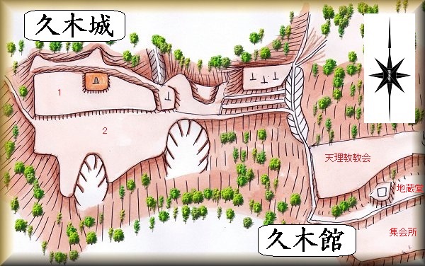 天理教教会の西方にある比高20mほどの台地先端部分が久木城の跡である。登り道を探してみたのだが、どうにも分からなかった。
