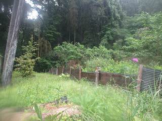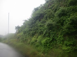 バイパスと接続するT字路のところから、コンクリート擁壁の上に登る道が付けられていたので、これを進んでみる。しかし、道はここまでで、後はヤブ漕ぎ直登が必要なようである。