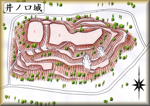 井ノ口城は、巴川から国道に沿って西側に入り込んで行った集落内部にある。比高30mほどの独立台地であり、この台地一帯に「城」という地名が残されている。