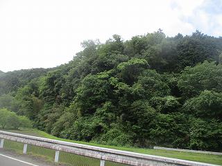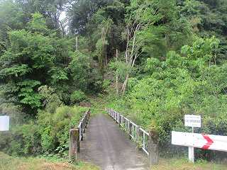 | 北側から遠望する則定小畑城。ここからの比高は30mほどある。 | 橋が架かっているので、これを渡って進んで行く。 |