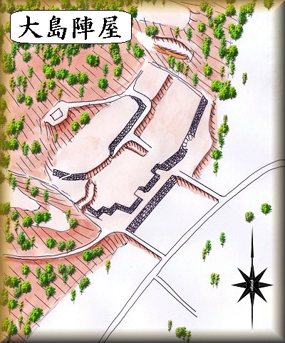 大島陣屋は、巴川から西側の谷間の集落の内部に入り込んで行った所にある。西側に急峻な山稜を控えた微高地に築かれた陣屋である。