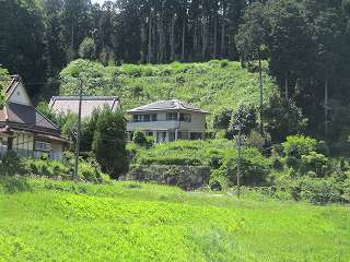 遠くからでも城塁がはっきりと見えており、尾根基部の堀切も見えている。ただし、そこまで登って行くルートが分からなかった。車を停められそうなところも近くにまったくない。