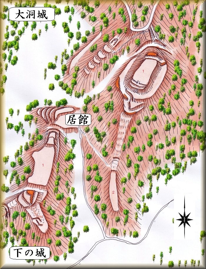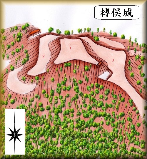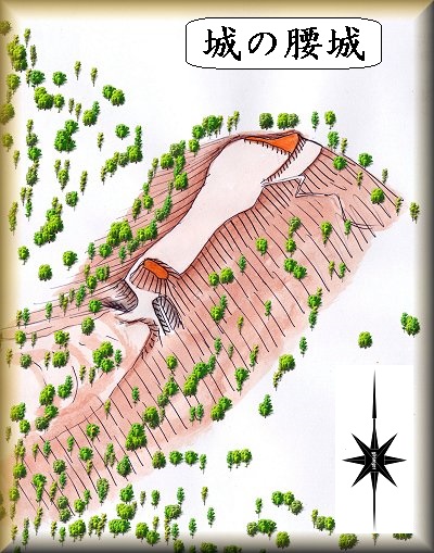 そんなわけで登り口が分からず、登城は断念した。鳥瞰図は上記の書の図に基づいて作成したものである。