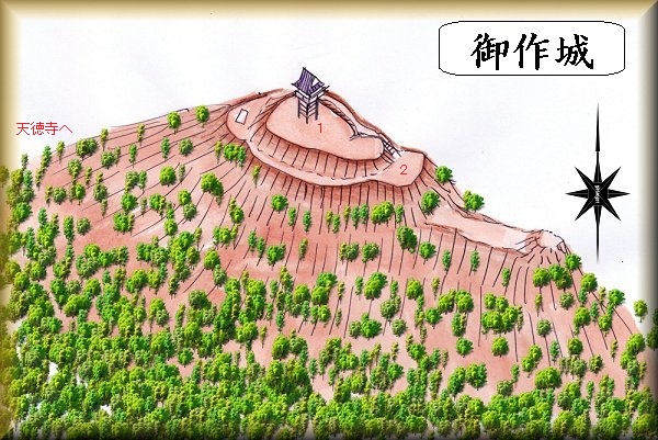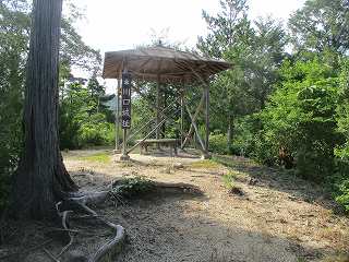 | 西方から遠望する御作城。ここからの比高は120mほどある。 | 山頂の展望台。 |