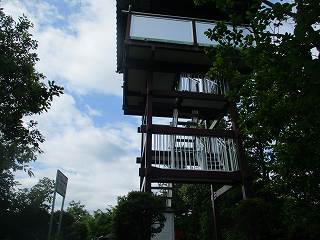 やがて山頂部分に到達する。一段低く小屋の建てられているスペースがある。その上が山頂の1郭。ここに大きな展望台が建てられている。