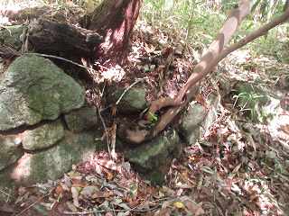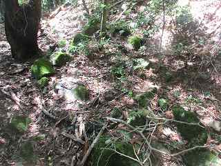 そうして登り切ったところが1郭下の横堀部分である。正面には1郭の城塁がそびえて見えている。すぐ脇の堀状の窪みの中には石が多数転がっていた。かつては石積みがあったかもしれない。