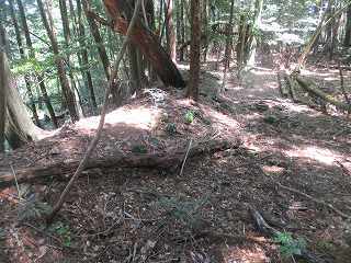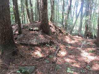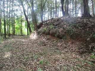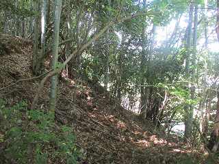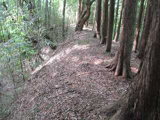 犬走の先が3郭である。3郭の北東側には土塁が盛られており、その先の堀切で、尾根基部の部分を分断している。