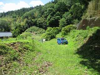 山麓に天神社が祭られているので、これを目指して行く。神社の西側には空き地があったので、車はそこに停めさせていただいた。