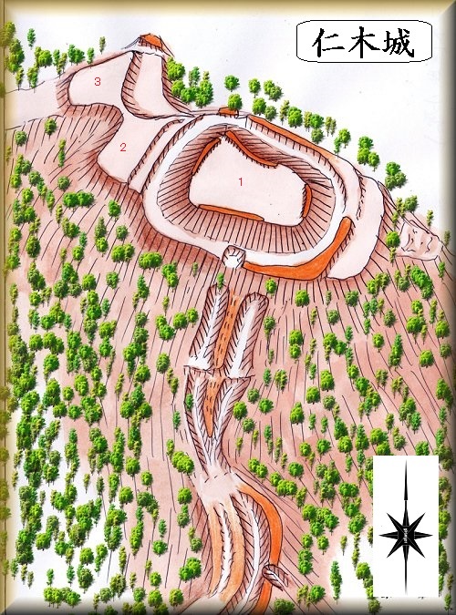 このように見ると、仁木城の主要な郭は1だけということになりそうである。その周囲はしっかりと切岸加工され、横堀や腰曲輪が造成されている。小さいながらもよく加工された山城である。