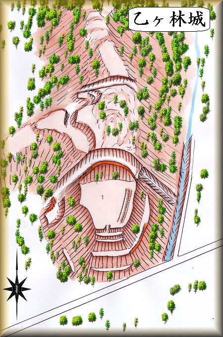 乙ヶ林城は、乙ヶ林の集落の北東側にそびえる比高20mほどの山稜の先端部分に築かれていた。