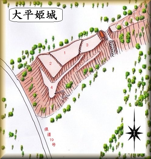 姫城について歴史等は未詳であるが、上記の通り、大平本城の支城だったものと思われる。