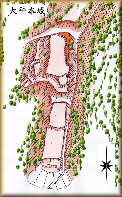 大平の八王子神社のある比高30mほどの山稜が大平本城の跡である。すぐ北側に姫城という城もあるので、それと区別するために単に大平城ではなく、大平本城と呼んでいるようである。