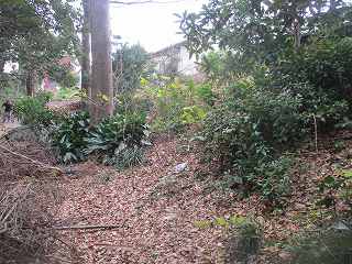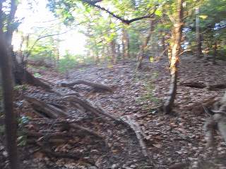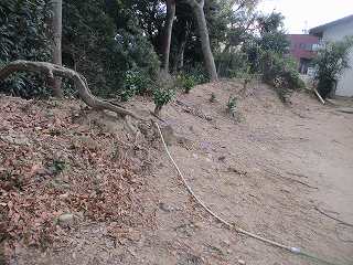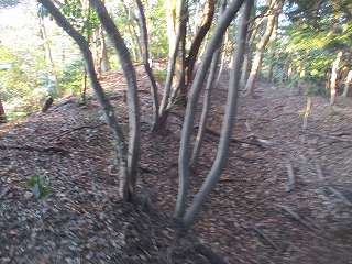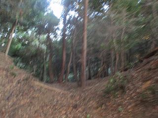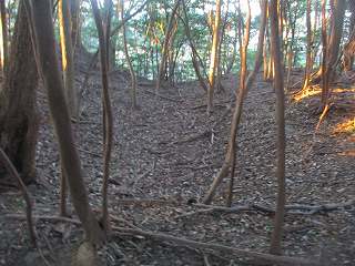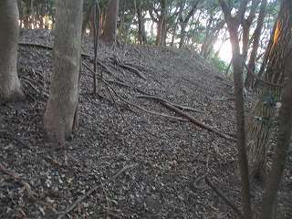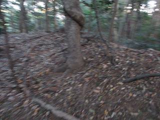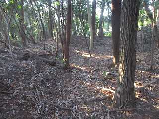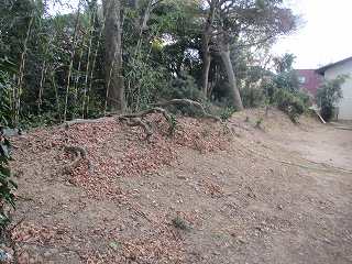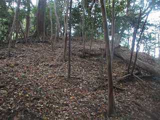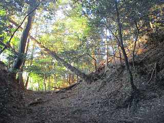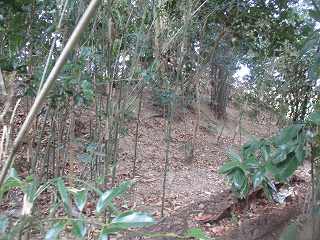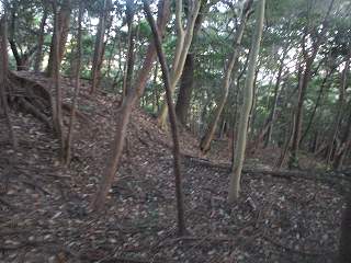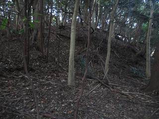 | 最初間違えて城の南側の上の山に登ってしまった。ところがこちらにも人工的な地形があった。土塁状の部分。 | 上の山の切岸状部分。 |