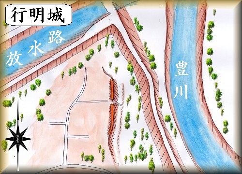 行明城は、豊川と支流とが合流する頂点の地形のところに築かれていた。現在、両方の川の土手に囲まれているために、一段低い地形となっているが、本来は川に面した微高地だったのだと思われる。