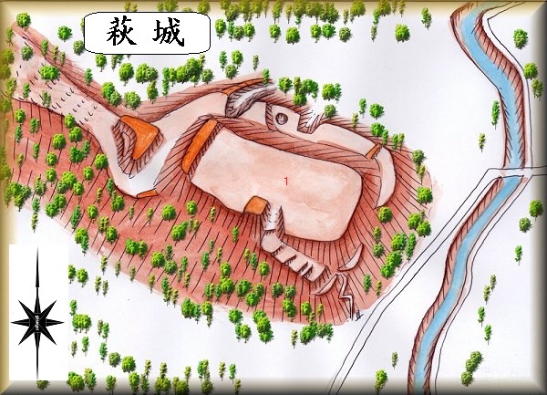 城の腰城から北西に少し進んだところにある。南側に小川が流れている比高30mほどの山稜が萩城の跡である。