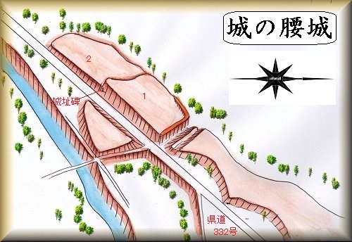 この県道沿いの比高10mほどの台地が城の腰と呼ばれており、城があったところであることを示している。