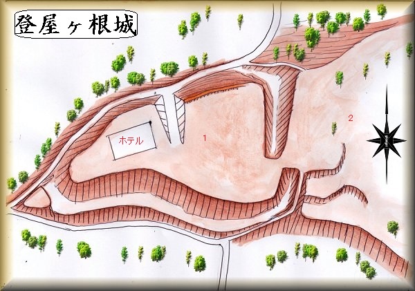 登屋ヶ根城の主郭部にはホテルミンクスというラブホテルが建設されている。だが、このホテルはすでに廃業しているようで、そういうホテルに特徴的なきらびやかなネオンなどは全く点灯していなかった。