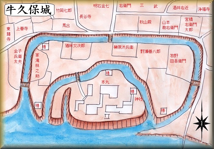 | 牛久保城は牧野氏の居城であった。 牧野氏は応永年間に牧野城を築き、さらに瀬木城を築いて拠点としていたが、享禄2年に新たに居城として築いたのが牛久保城であった。 永禄9年(1566)、牧野康成の頃から、戦国期の城としてさらに整備されていったと言われている。 天正18年(1590)、徳川家の関東移封に伴い、牧野氏は上野大胡2万石に転封となった。 その後、慶長5年まで吉田城主池田輝政の家臣であった荒尾平左衛門が居城としており、その際にも織豊期城郭として改修されていったと考えられる。 関ケ原後に池田氏が播州姫路に転封となった後は、廃城となったのではないかと考えられる。 |