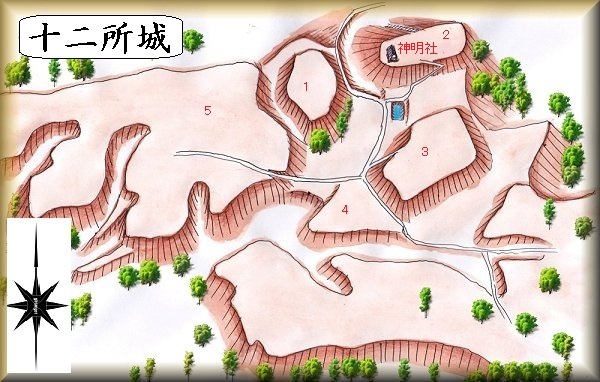 この道を進んで行くと、神明社の鳥居と石段とが見えてくるのだが、車はそのまま城内の鞍部にまで進入していけるので、そこまで車で入って行った方が、城内を回りやすいと思う。鞍部のところには「←十二所城本丸跡」と書かれた大きな看板が立てられている。その辺りは路肩も広くなっているので、車をちょっと停めさせておいても大丈夫であろう。