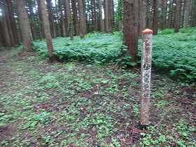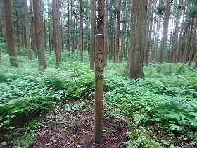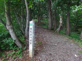 | 城内への入口を示す標柱。 | 登り始めるとすぐに十三塚が見えてくる。尾根伝いに塚が13個も並んでいるが、これは遺構じゃないよなあ。 |