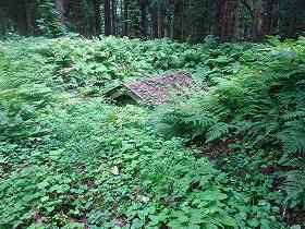 この斜面の上が7の郭である。登城道は7の郭の基部部分に到達する。その先に土塁で囲まれた方形の区画があった。ここにかつては神社が祭られていたようだが、社殿はつぶれてしまい、現在では屋根だけがかろうじて残されている。